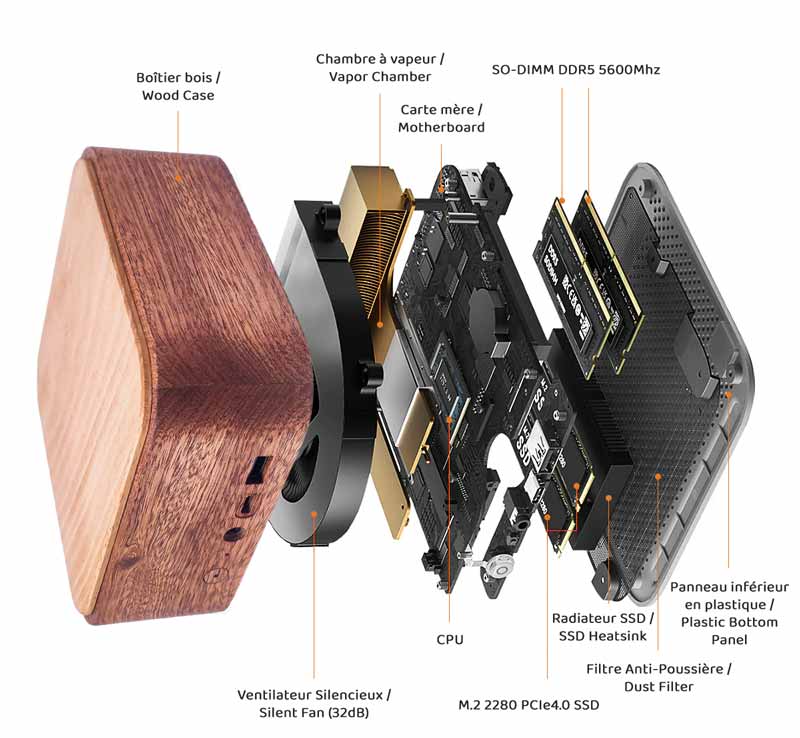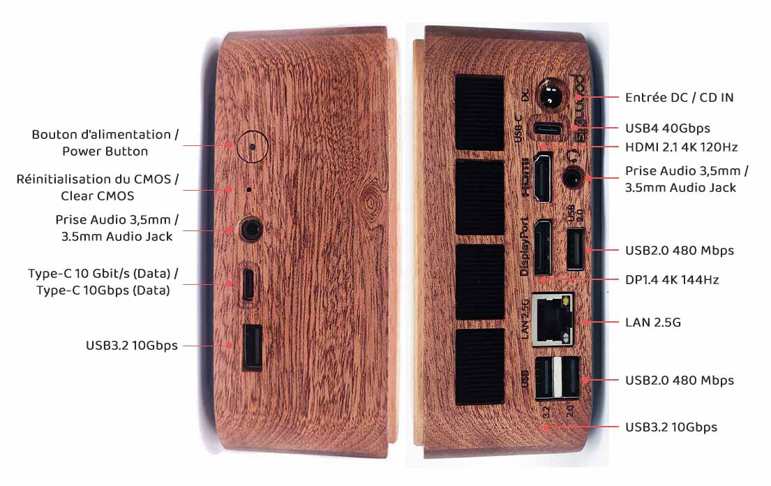 Découvrez l’élégance naturelle de ce mini PC aux côtés en sipo massif et dessus en hêtre massif, un mariage subtil de bois aux teintes et grains différents, façonné pour allier design et performance.