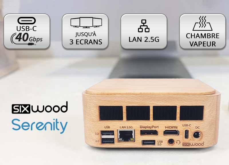 L’élégance n’exclut pas la performance. Avec une connectivité complète (USB-C, HDMI, Wi-Fi 6), le Serenity s’intègre instantanément à votre écosystème technologique. Toute la puissance d’un ordinateur de bureau moderne, dissimulée dans un écrin de bois minimaliste.