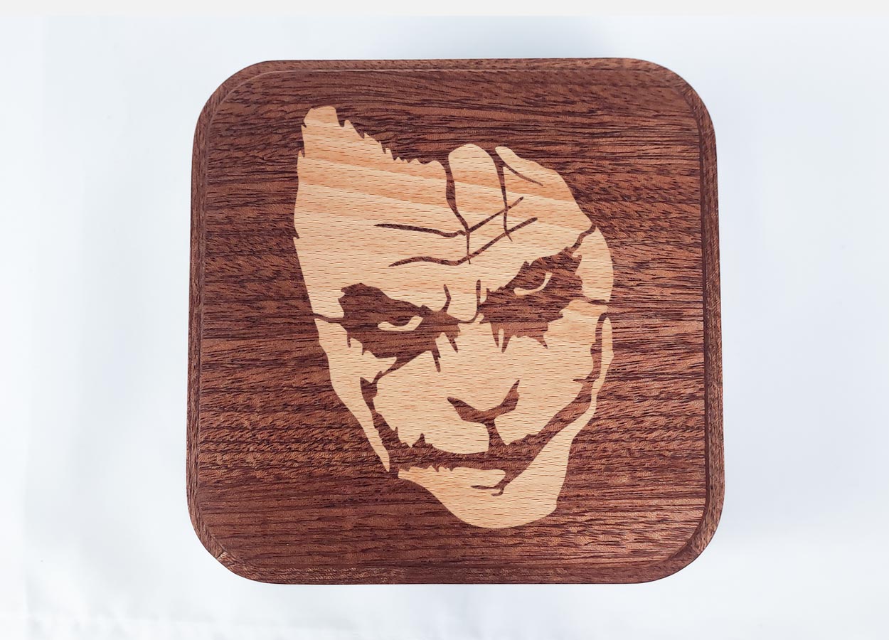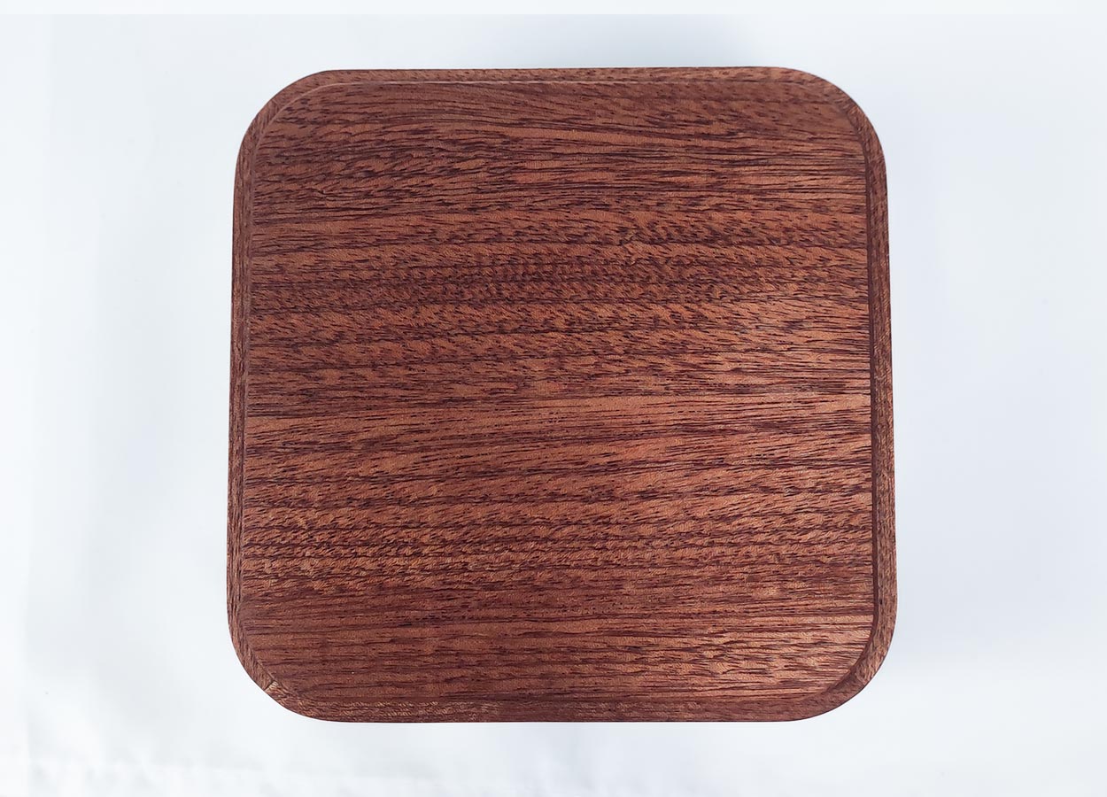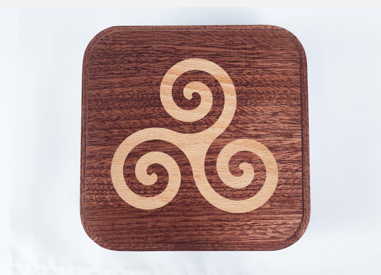 Je l’ai installé à côté de la télé sur mon meuble en verre et franchement, ça en jette. Le bois Sipo est magnifique, très profond, et ce qui m’a vraiment scotché c’est le motif Celtic sur le dessus. C’est du hêtre super clair, donc on voit tout de suite que ce n’est pas juste un dessin ou un coup de laser, mais bien un vrai morceau de bois clair assemblé dans le bois foncé. Le contraste est superbe et la surface est d’une douceur incroyable au toucher.