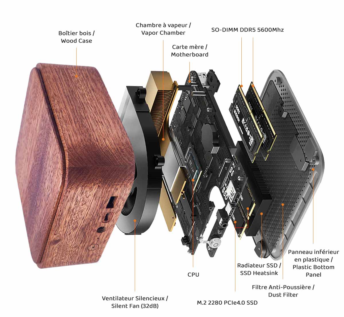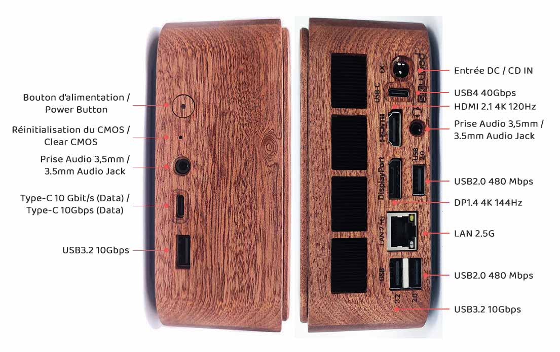 Ce mini PC en bois de sipo se distingue par son caractère affirmé et son design soigné. Le sipo massif, sélectionné pour sa stabilité et ses nuances profondes, donne naissance à un boîtier élégant, pensé pour intégrer des composants performants dans un écrin naturel et durable.