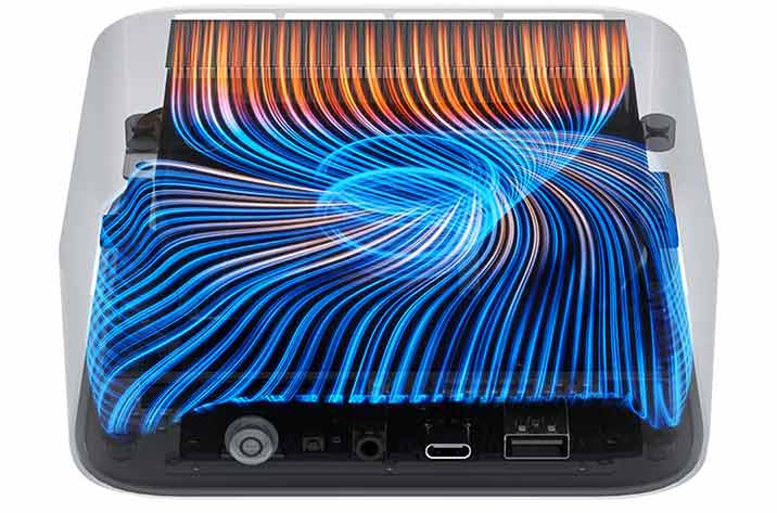 La conception du boîtier est étudiée pour favoriser la circulation de l’air et le refroidissement des composants. Le bois participe également à l’absorption des vibrations, pour un fonctionnement plus silencieux.
